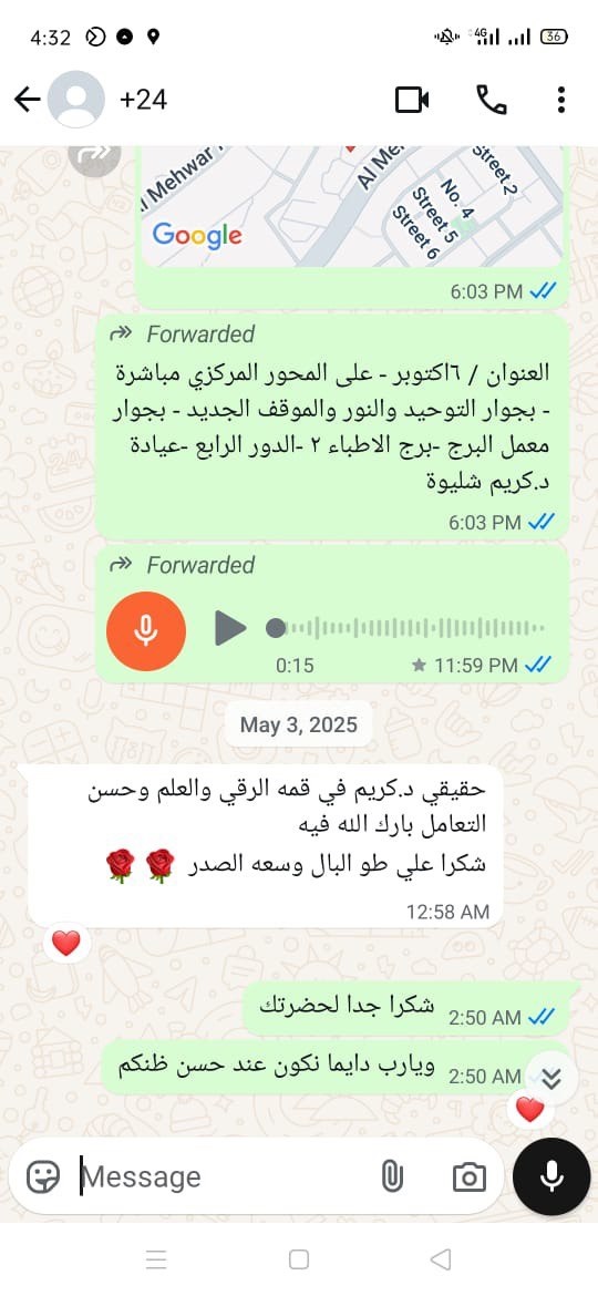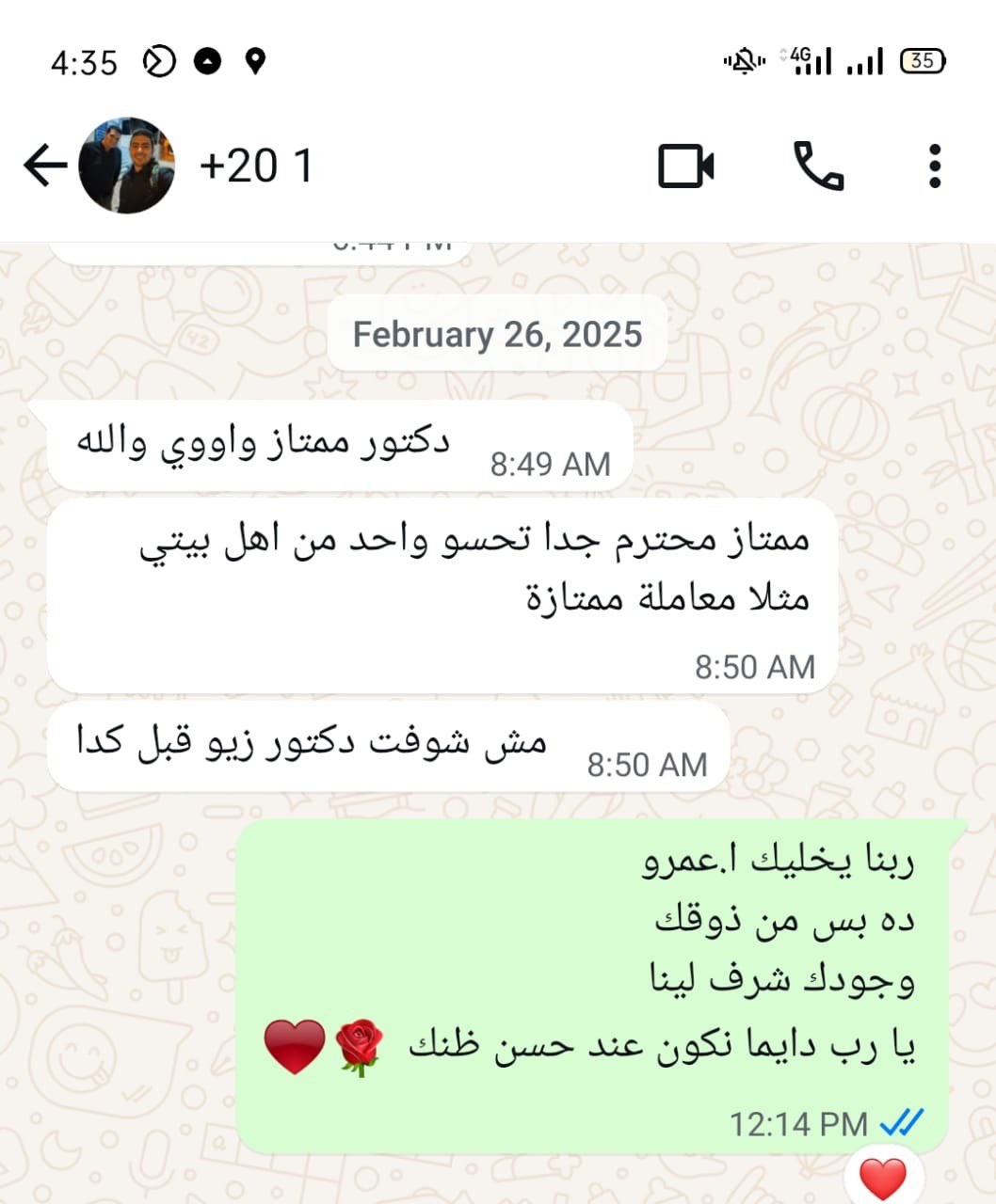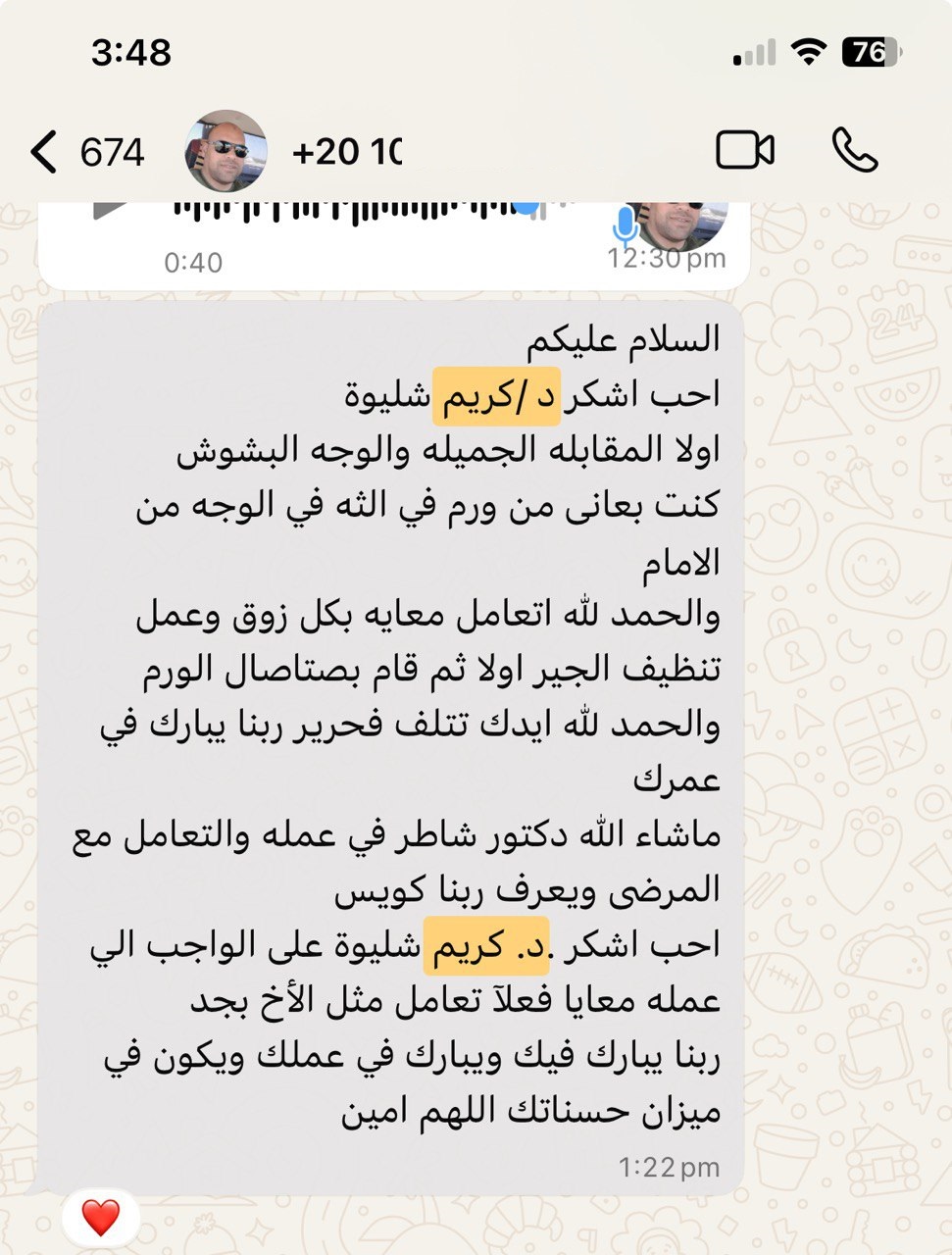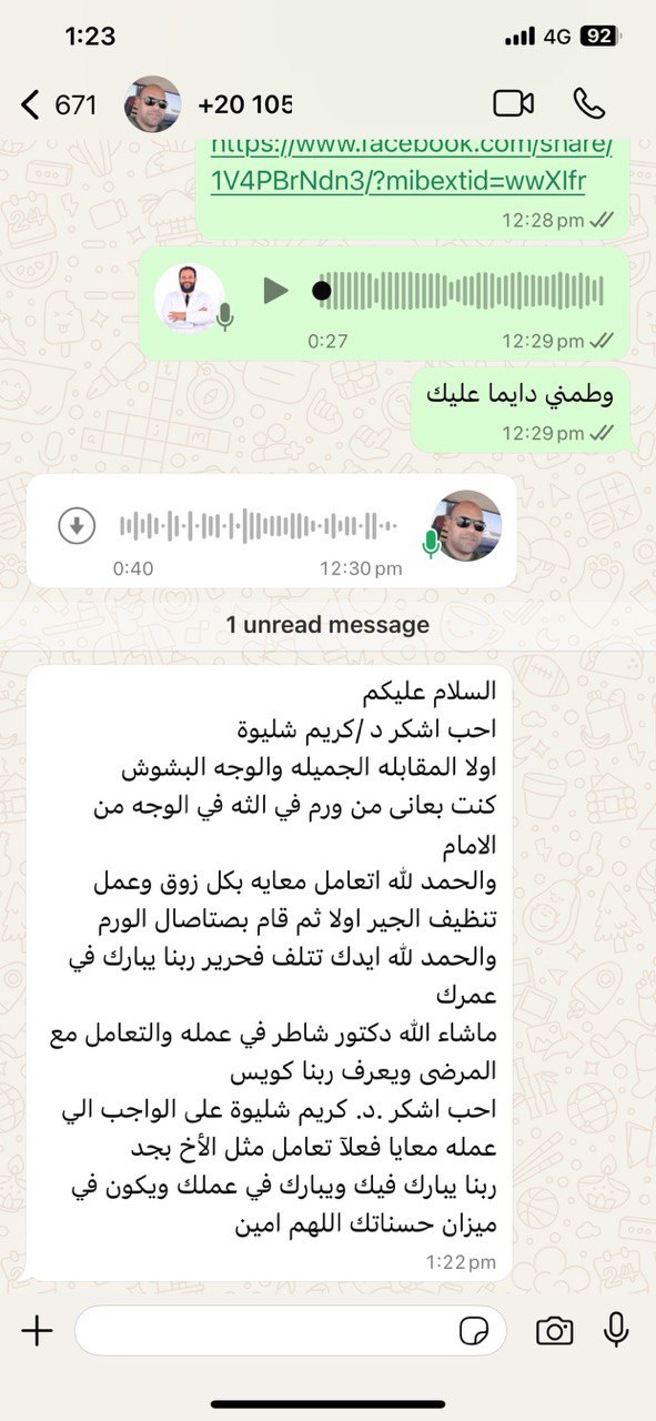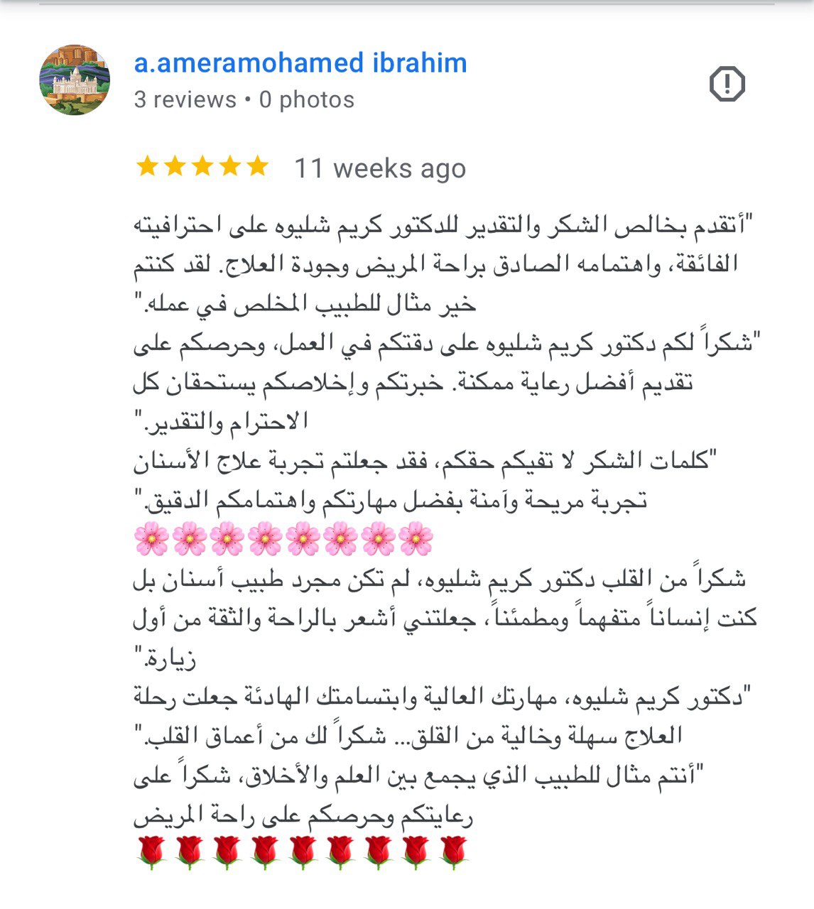 شارك معكم تجارب وآراء مرضانا حول خدمات الدكتور كريم شليوة، لتتعرفوا على مستوى الرعاية والجودة المقدمة بثقة واطمئنان.
