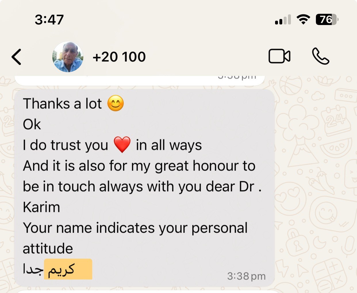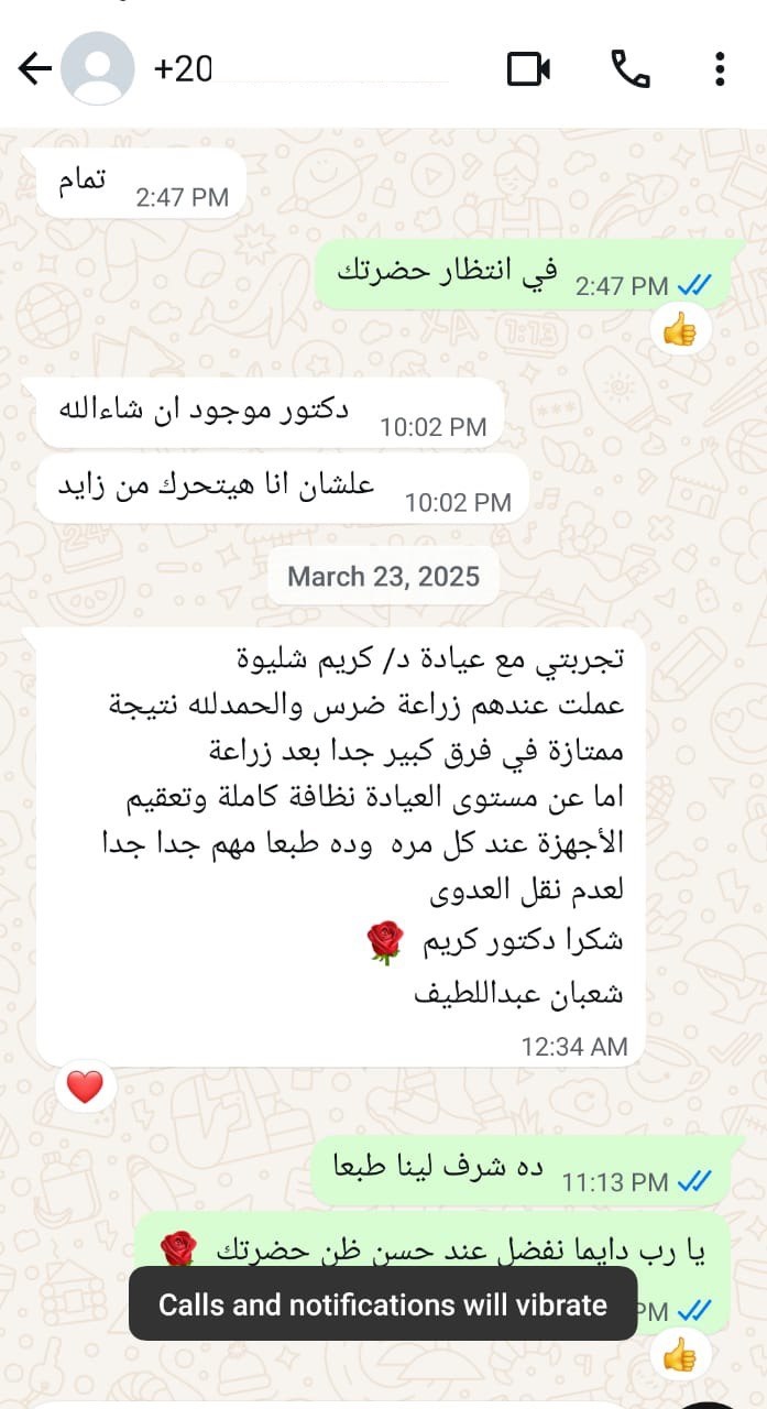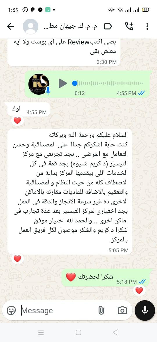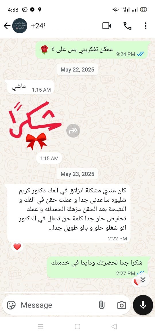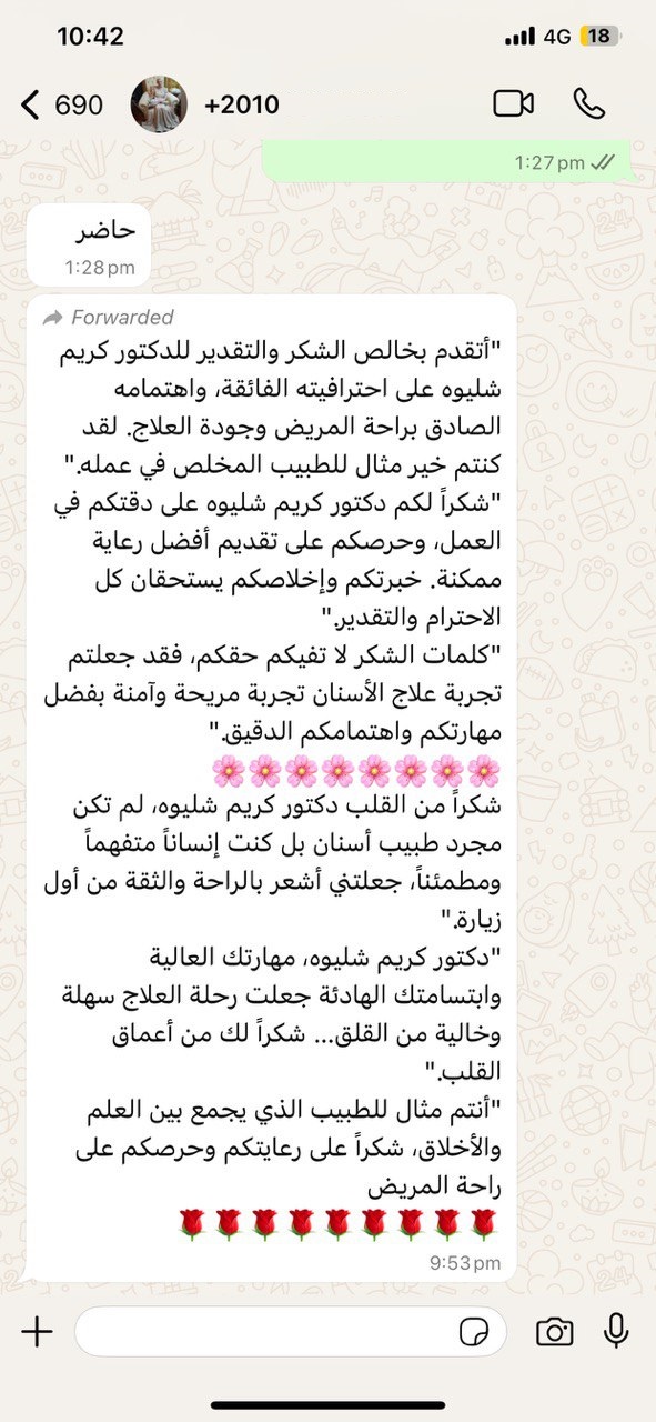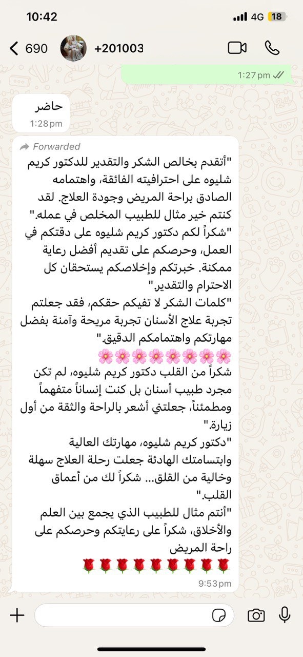 شارك معكم تجارب وآراء مرضانا حول خدمات الدكتور كريم شليوة، لتتعرفوا على مستوى الرعاية والجودة المقدمة بثقة واطمئنان.
